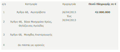 Το Υπουργείο Αγροτικής Ανάπτυξης και Τροφίμων μετά την ολοκλήρωση των ελέγχων από τον ΟΠΕΚΕΠΕ ανακοίνωσε ότι από σήμερα και προοδευτικά μέχρι τις 30 Απριλίου θα πραγματοποιηθούν όπως είχε προγραμματισθεί πληρωμές ύψους 85 εκ. € και οι οποίες συγκεκριμένα θα αφορούν: 1) Τους κτηνοτρόφους των ορεινών και μειονεκτικών περιοχών της χώρας με τις πληρωμές για το άρθρο 68 και το υπόλοιπο de minimis